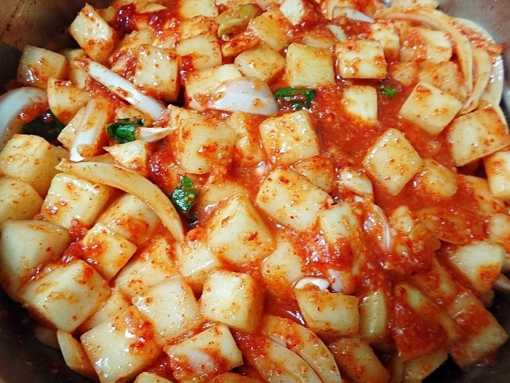 - 양념 만들기 : 절여진 무에 고춧가루, 설탕, 다진 마늘, 액젓을 넣고 잘 버무려줍니다. 이때, 무의 수분이 충분히 나와야 양념이 잘 배어듭니다.