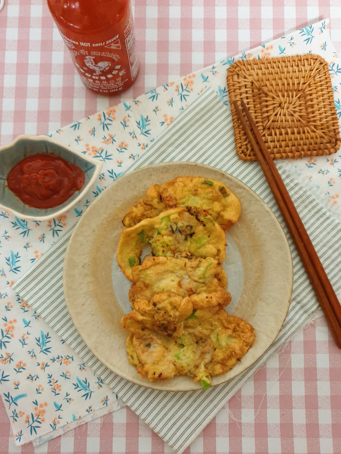 4. 팬에 기름을 두르고 센 불로 달군 후 반죽을 숟가락으로 떠서 올려줍니다.