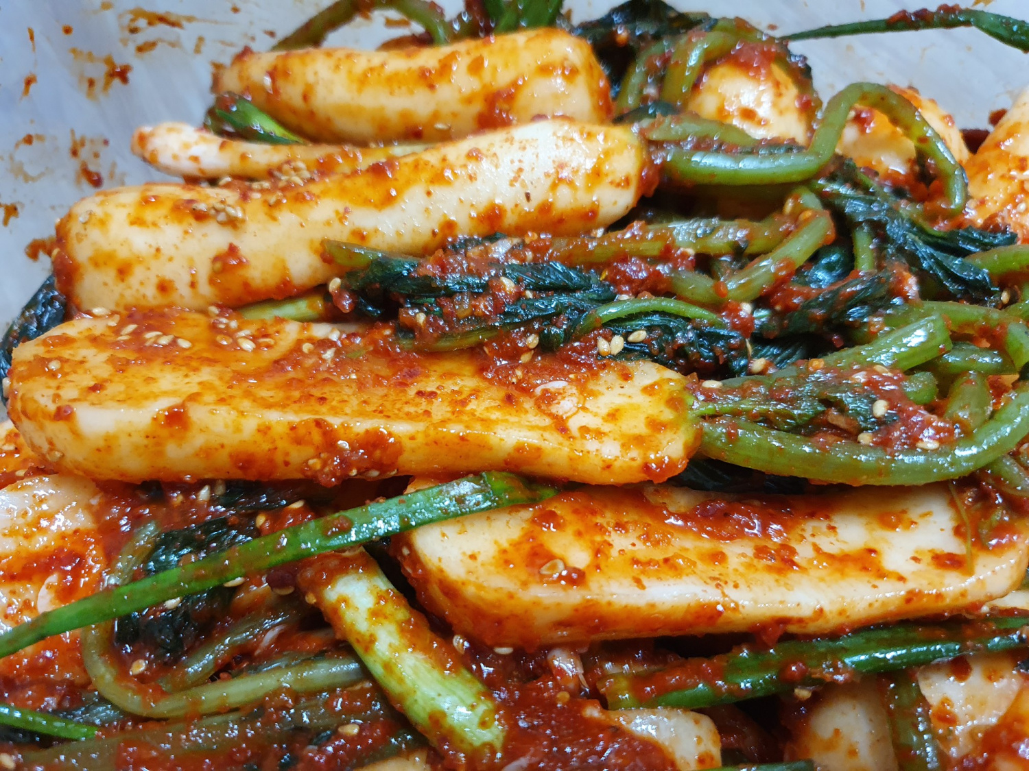 찹쌀가루를 물에 풀어 끓여 찹쌀풀을 만듭니다. 그 후, 다진 마늘, 생강, 양파, 배, 홍고추를 믹서에 갈아 양념장을 만듭니다. 여기에 설탕, 액젓, 새우젓을 넣고 잘 섞어줍니다. - 무와 양념 섞기