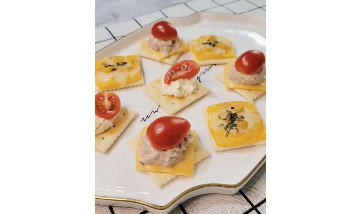- 크래커 위에 혼합한 참치 믹스를 올리고, 원하는 채소로 장식합니다.